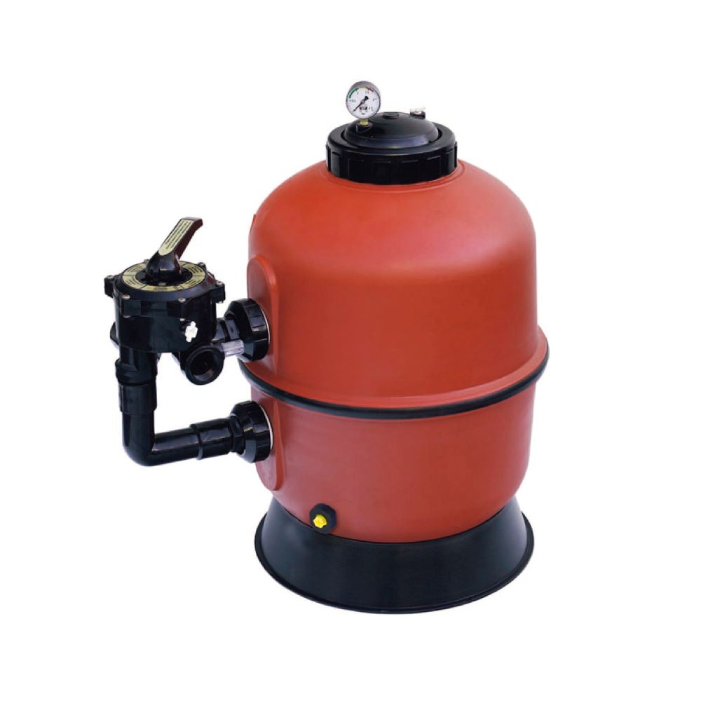 -Material plástico da único-parte sem junções manufacturado pelo processo de sopro. -Abertura da tampa superior do filtro por meio do sistema da cinta. -Inclui manómetro, válvula de seletor lateral de 6 vias e base para uma estabilidade perfeita na sua localização nas instalações técnicas da piscina. -Pressão máxima de trabalho: 2 kg/cm ²