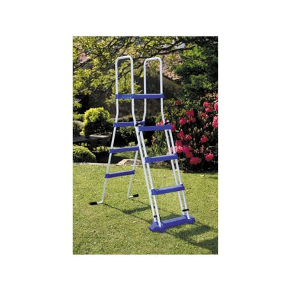 Equipamento: Parede: Chapa de aço galvanizado de 45/100 de espessura. A chapa está cortada para o skimmer filtrante. Perfis: Conta com 8 perfis verticais de 12 cm de largura para a obtenção de uma maior resistência Embelezadores: Protetores de injeção na união superior dos perfis horizontais. Acabamento: Chapa e perfis de aço galvanizado lacado. Embelezadores de PVC cor branco. Forro: PVC color azul 30/100, com sistema overlap. Tratamento anti ultravioleta (atrasa o envelhecimento do PVC). Filtro: Filtro de cartucho de 7,0 m3/h. Escada: Escada de segurança com plataforma. É de aço galvanizado e lacado em cor branco, plataforma superior e com frontal extraível.
